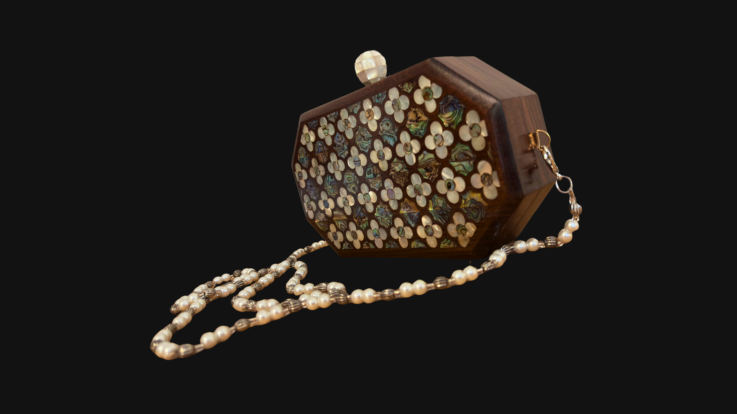 Jouri – Luxury Damascene Clutch with Mother of Pearl Rose Inlay & Pearl Rosary Chain