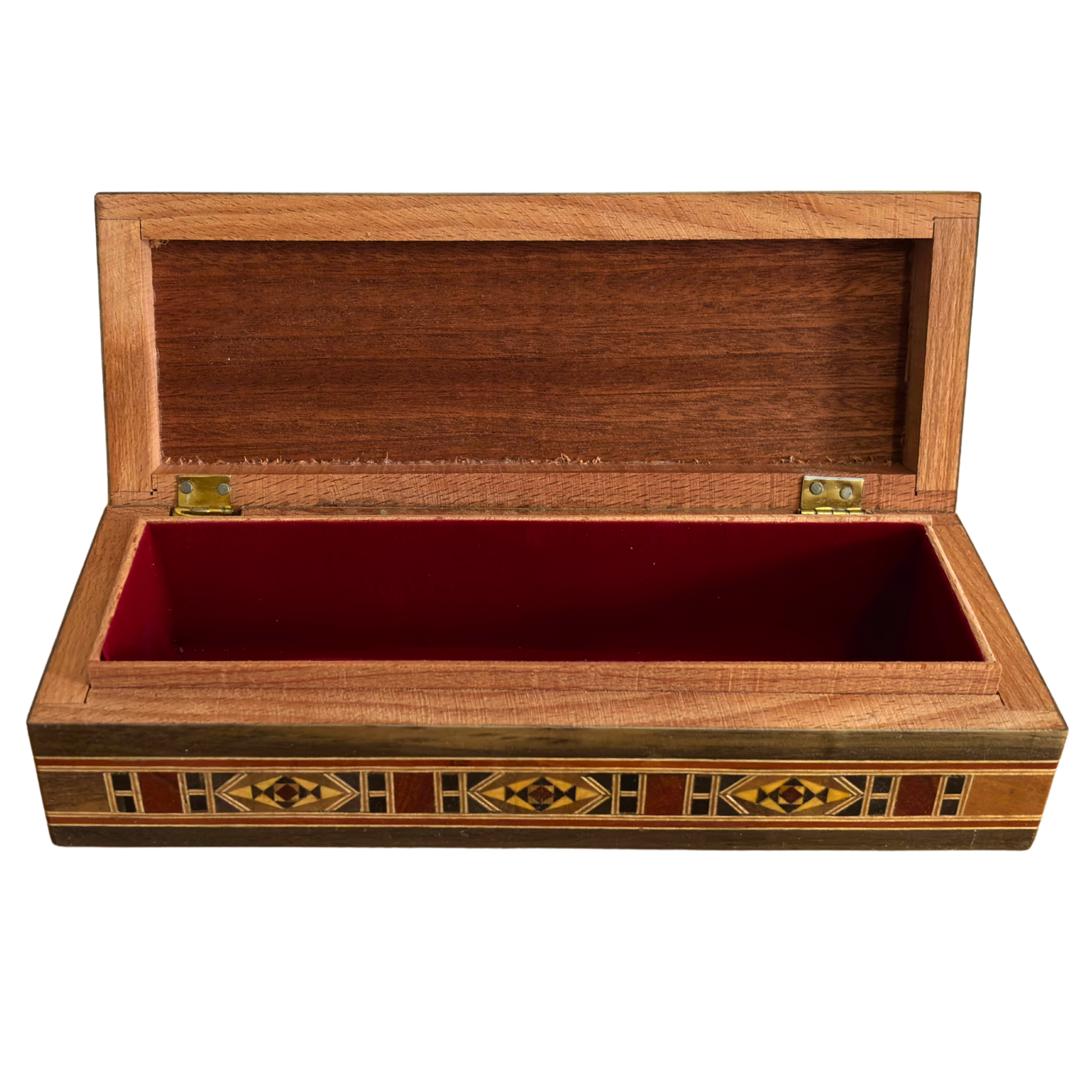 handgefertigte Mosaik-Holzbox, lange rechteckige Einlegebox, Perlmutt-Stiftebox, syrische Mosaik-Schmuckbox, hölzerne Andenkenkiste, elegantes handgefertigtes Geschenk, arabische geometrische Dekoration, orientalische Kunstbox, kunsthandwerkliche Aufbewahrungsbox, Damascus Box, syrische Schatulle, Geschenk für Sie, Geschenk für Ihn