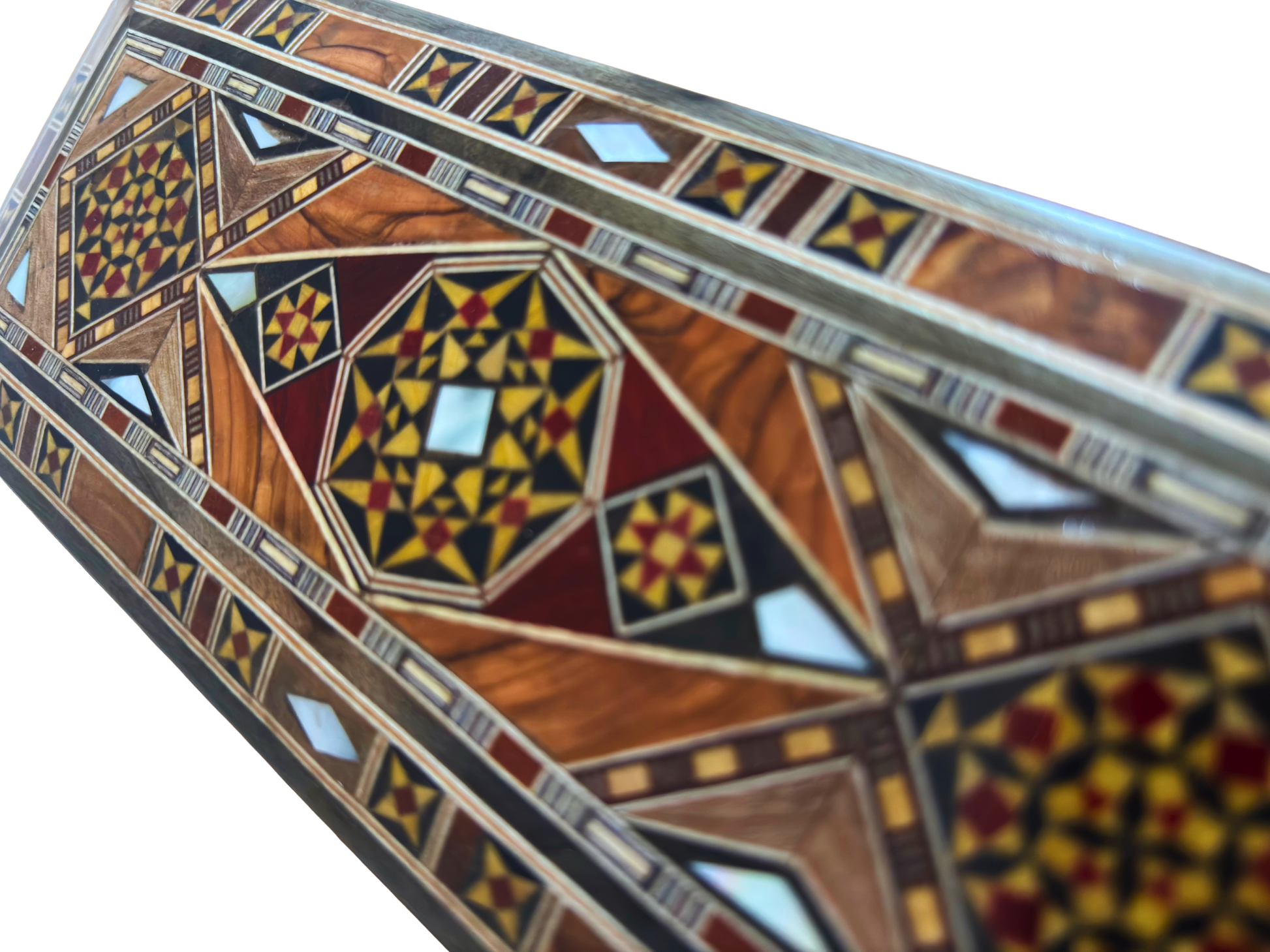 Verleihen Sie Ihrem Raum mit dieser beeindruckenden, handgefertigten Damaszener Mosaikbox in länglicher rechteckiger Form eine besondere Note, die sowohl praktisch als auch künstlerisch ist. Sorgfältig von erfahrenen Kunsthandwerkern aus Eukalyptus-, Nussbaum-, Rosen-, Buche-, Zitronen- und Gelbkiefernholz gefertigt und mit schimmerndem Perlmutt verziert, zeigt diese Box traditionelle, geometrische Mosaikmuster, inspiriert von syrischer Kunstfertigkeit.