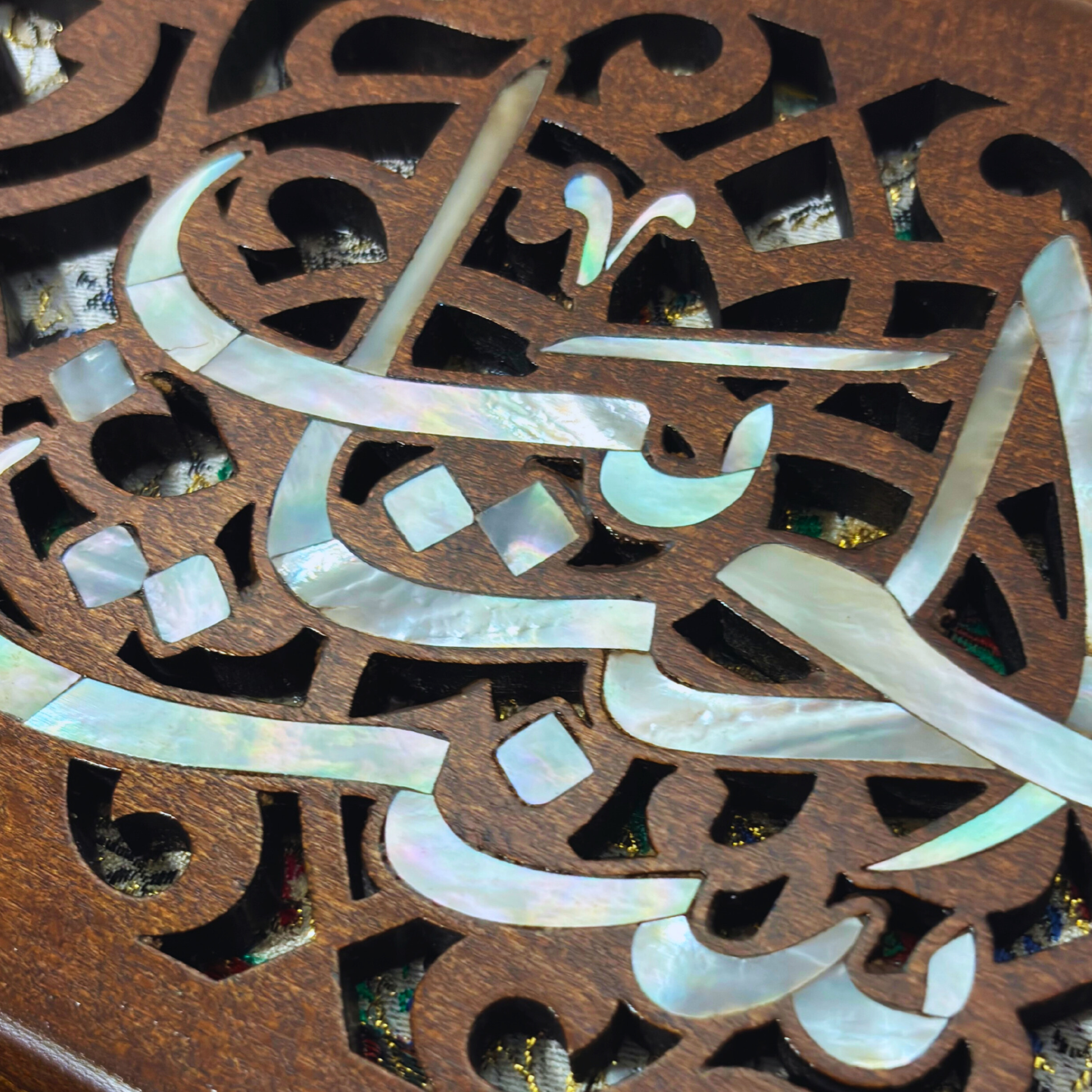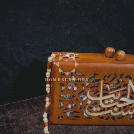 Tallado en madera de nogal y decorado con incrustaciones de nácar, este clutch refleja la elegancia refinada de la artesanía damascena. La cadena desmontable tipo rosario permite llevarlo al hombro o como bolso de mano.