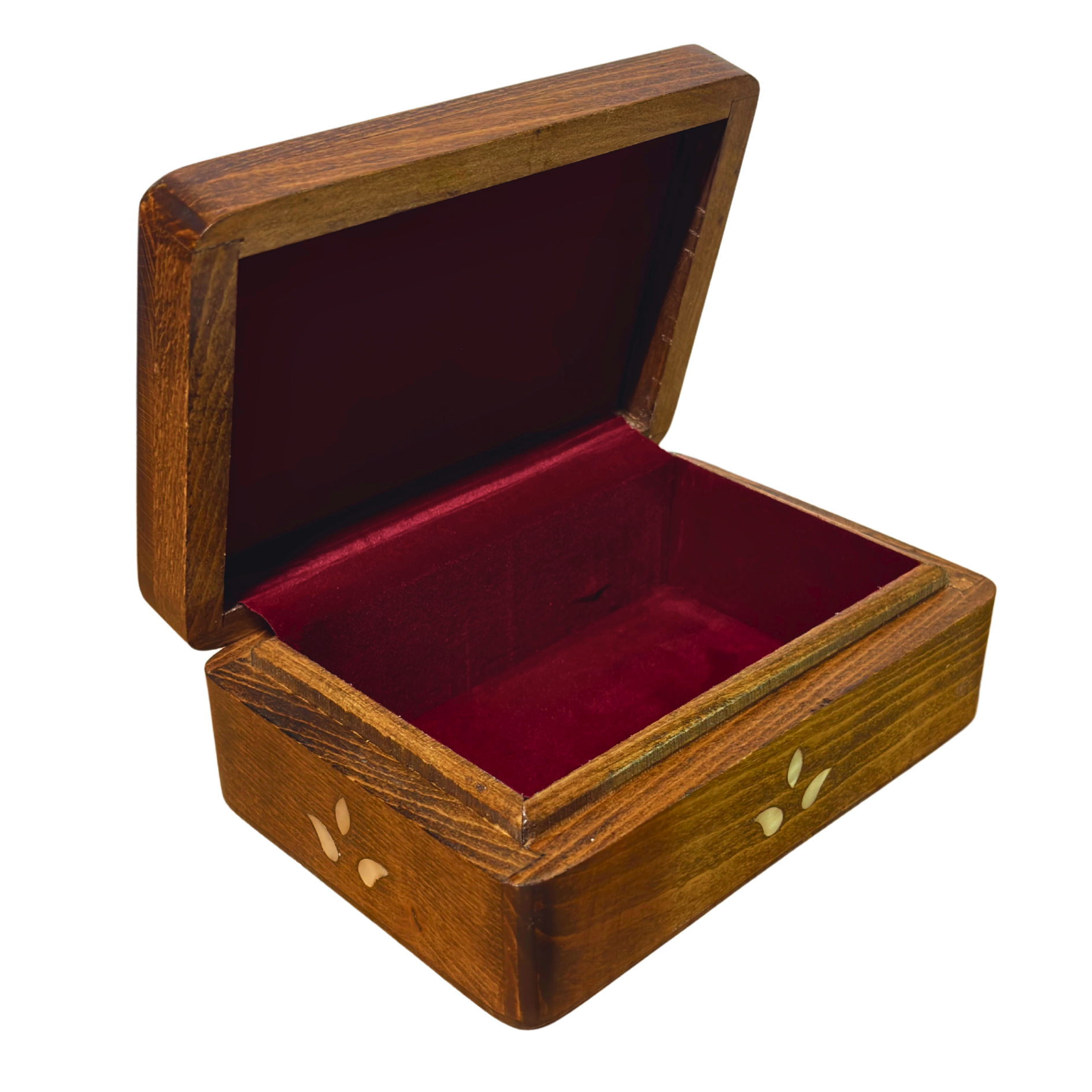 Presenta un acabado en nogal oscuro, incrustaciones de nácar y un elegante forro de terciopelo color vino, creando una pieza de artesanía excepcional.