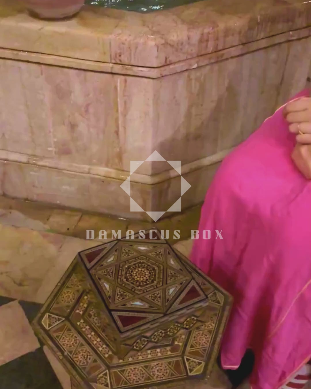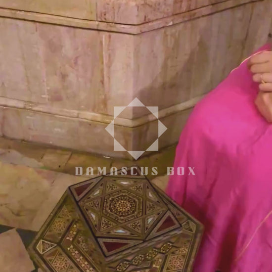 caja de mosaico damasquino, Gaby Al Dayeh, nácar, madera oriental, arte sirio, terciopelo, artesanía de lujo, Damascus Box