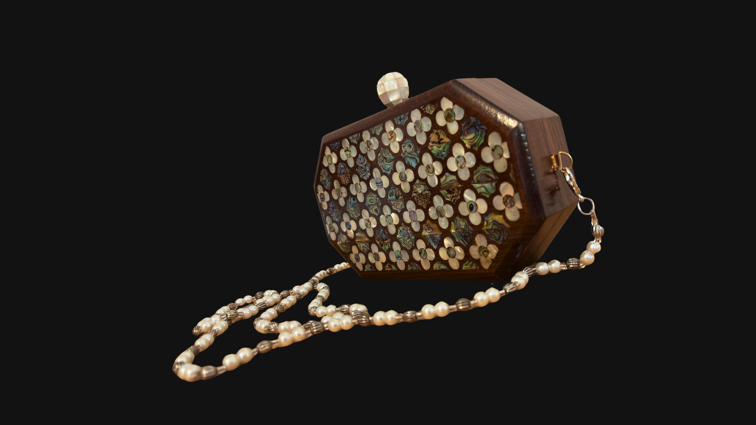 Jouri – Pochette Damasquine de Luxe avec Nacre Florale & Chaîne de Perles