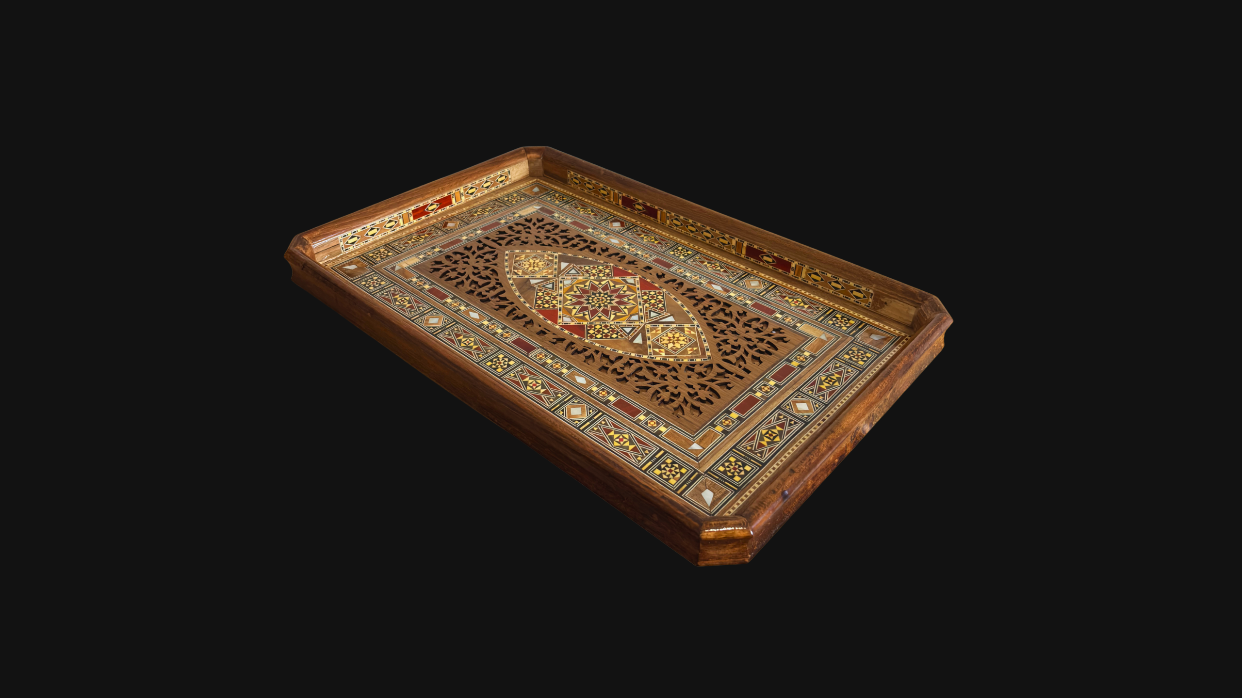 Plateau Damasquiné en Bois – Incrustation de Nacre & Tons Naturels du Bois