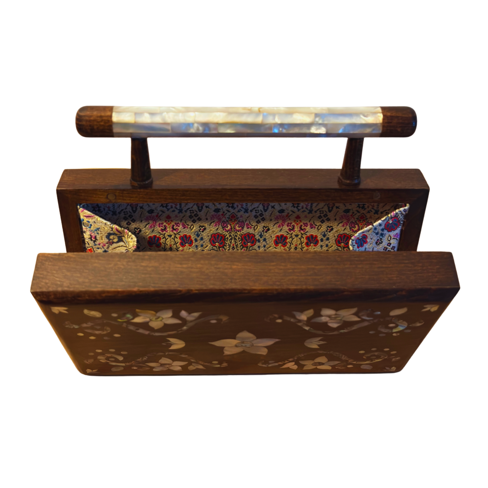 sac damasquiné, nacre florale, noyer, art oriental, brocart, fait main, Damascus Box