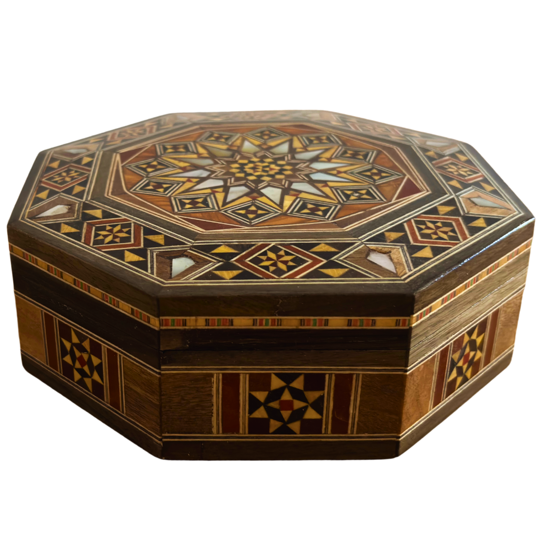 Elegante scatola ottagonale in mosaico damascato – Legno artigianale con intarsio in madreperla