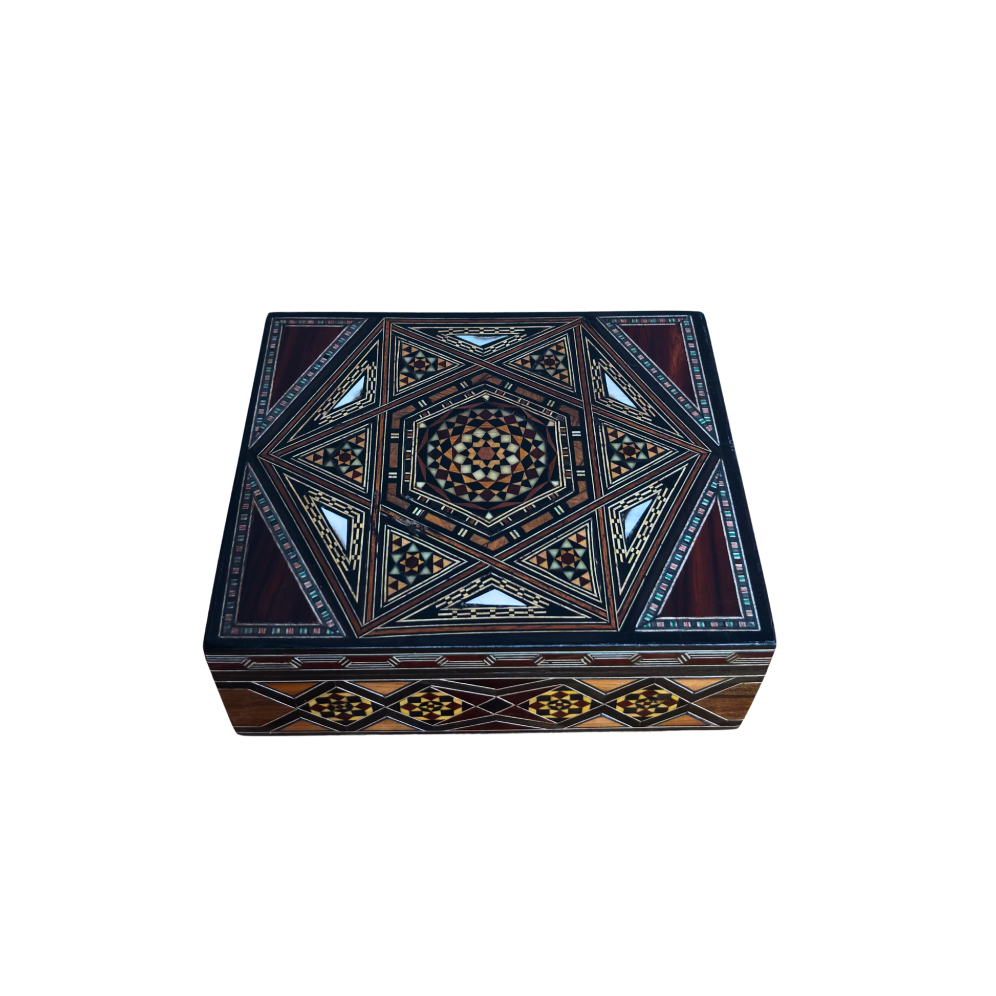 Questa scatola damaschina a mosaico è un’opera del celebre Gaby Al Dayeh, maestro artigiano di 90 anni considerato un simbolo vivente dell’arte del mosaico siriano.