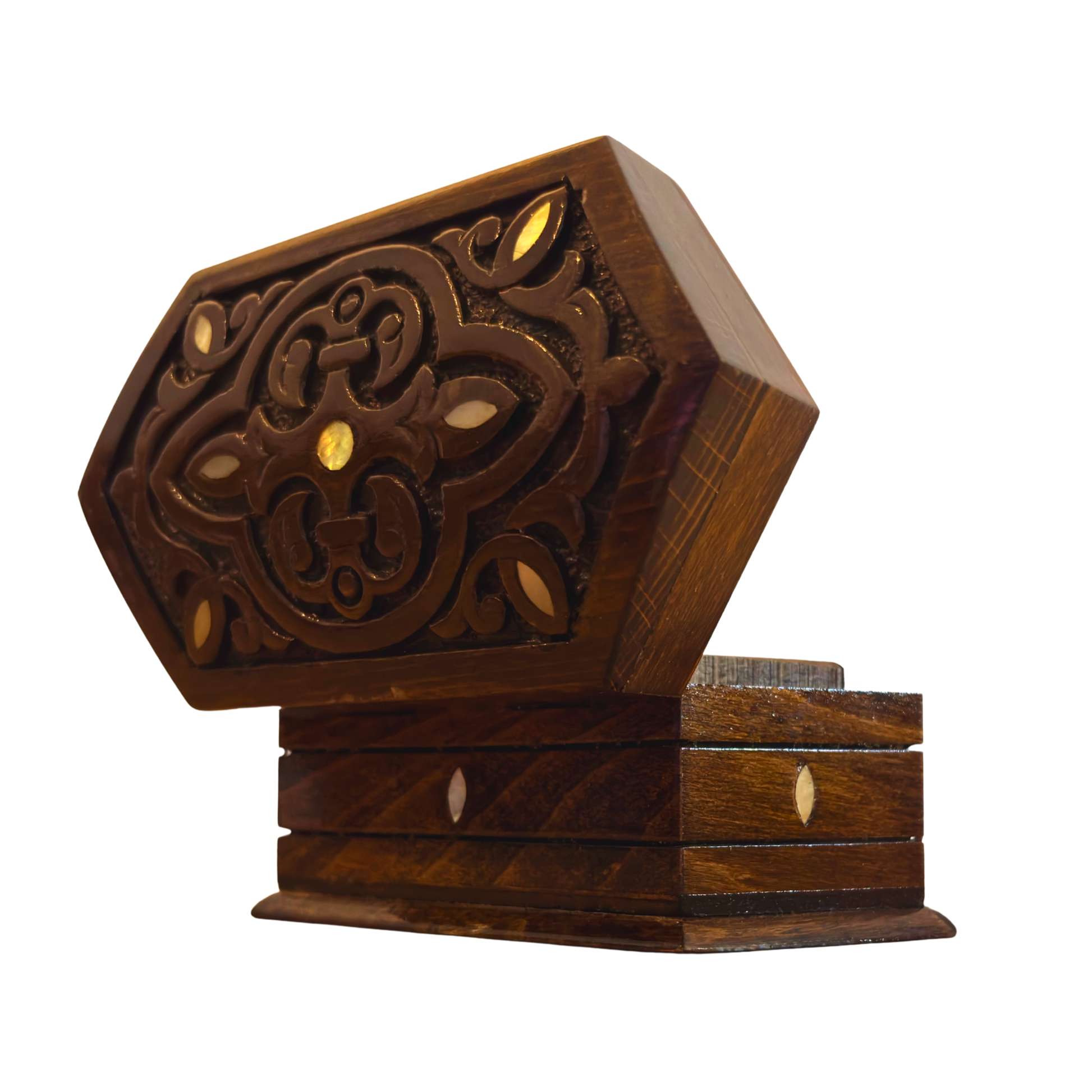Deze Damascener houten doos onderscheidt zich door haar fijn handgesneden patronen en subtiele oosterse details, geïnspireerd op de traditionele Syrische kunst.