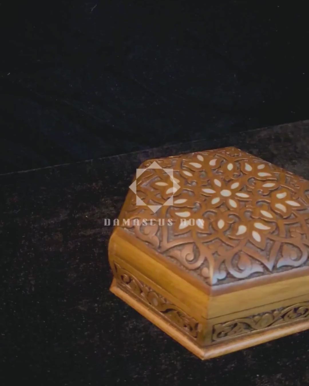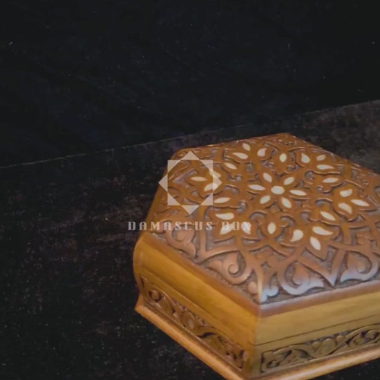 handgesneden doos, parelmoer doos, vakmanschap uit damascus, luxe houten doos, zeshoekige doos, Damascus Box
