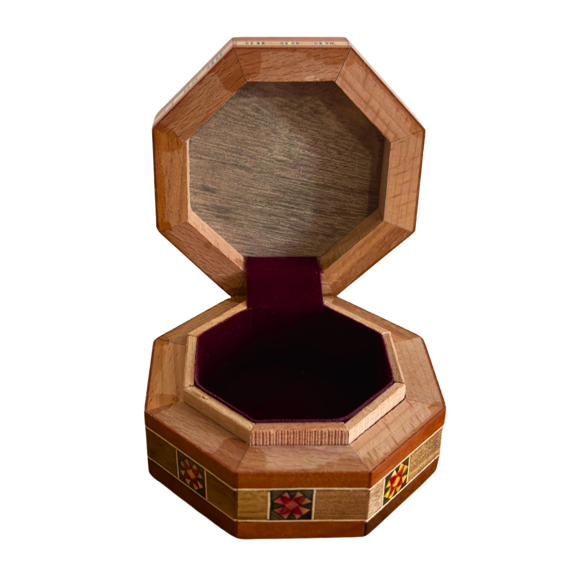 Deze charmante mini octagonale Damascene mozaïekdoos is een waar bewijs van vakmanschap en tijdloos design. Met de hand gemaakt van premium walnoot-, beuk-, citroen- en geel dennenhout, is de buitenkant prachtig afgewerkt in een warme rustieke terracottakleur, die de aardse elegantie van herfstlandschappen oproept.