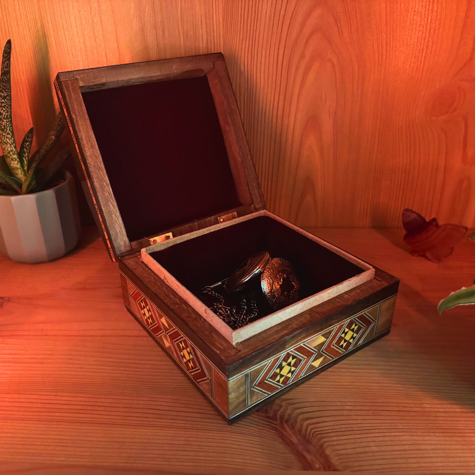 kleine mozaïek sieradendoos, handgemaakte houten doos, Damascene ingelegde doos, oosterse herinneringsdoos, houten snuisterijdoos, parelmoer cadeau doos, vierkant houten geschenk, Arabische mozaïekdoos, Syrisch handwerk, uniek kerstcadeau, ambachtelijke Valentijnsdag doos, Damascus doos, Syrische doos, cadeau voor haar, cadeau voor hem