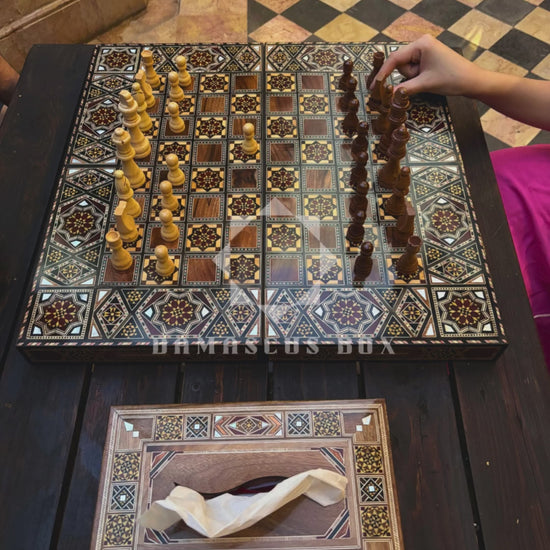 Ten elegancki zestaw drewnianych figur szachowych doskonale uzupełnia nasze mozaikowe szachownice damasceńskie. Każda figura jest starannie wypolerowana i idealnie wyważona, aby zapewnić płynną i stylową grę.