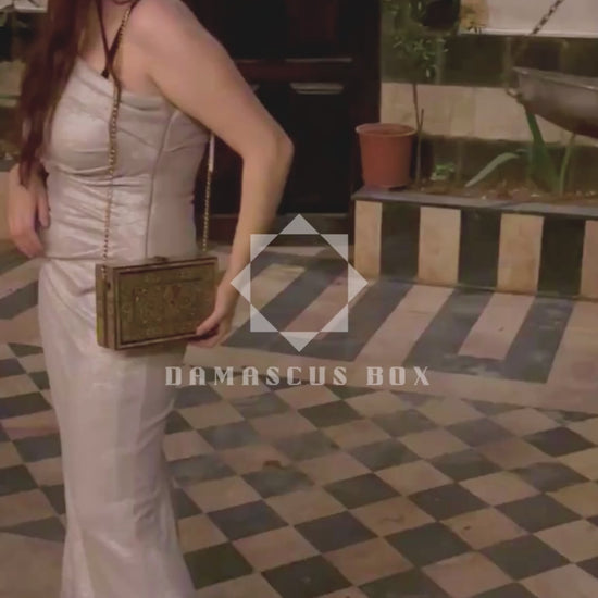 Damascene mosaic handbag, mother of pearl inlay, oriental wooden bag, handcrafted Damascus purse, Syrian mosaic art, luxury evening bag, velvet interior, golden chain, Damascus Box