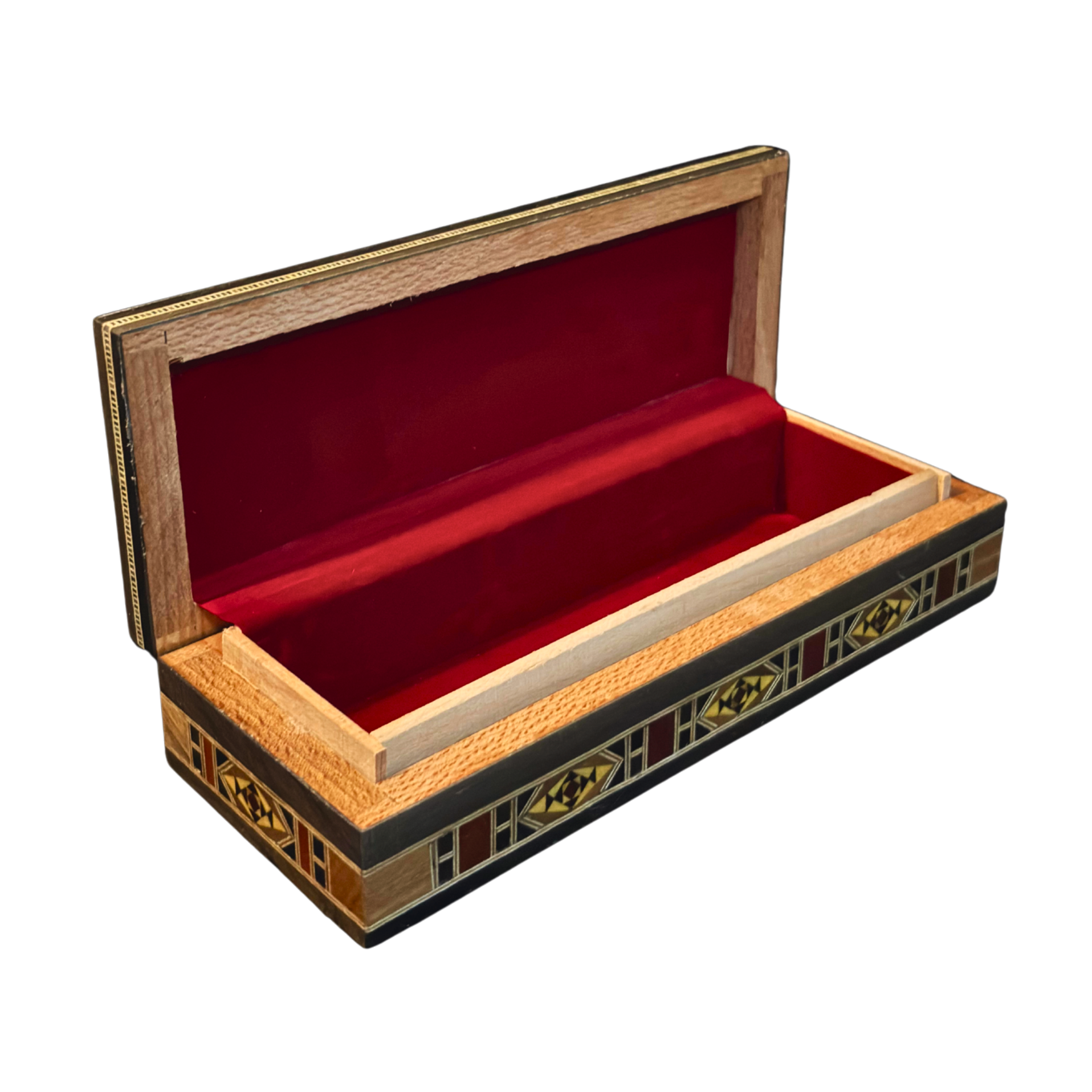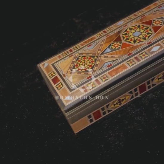 handcrafted mosaic wood box, long rectangular inlay box, mother of pearl pen box, Syrian mosaic jewellery box, wooden keepsake chest, elegant handmade gift, Arabic geometric décor, oriental art box, artisanal storage box, Damascus box, Syrian box, gift for her, gift for him
