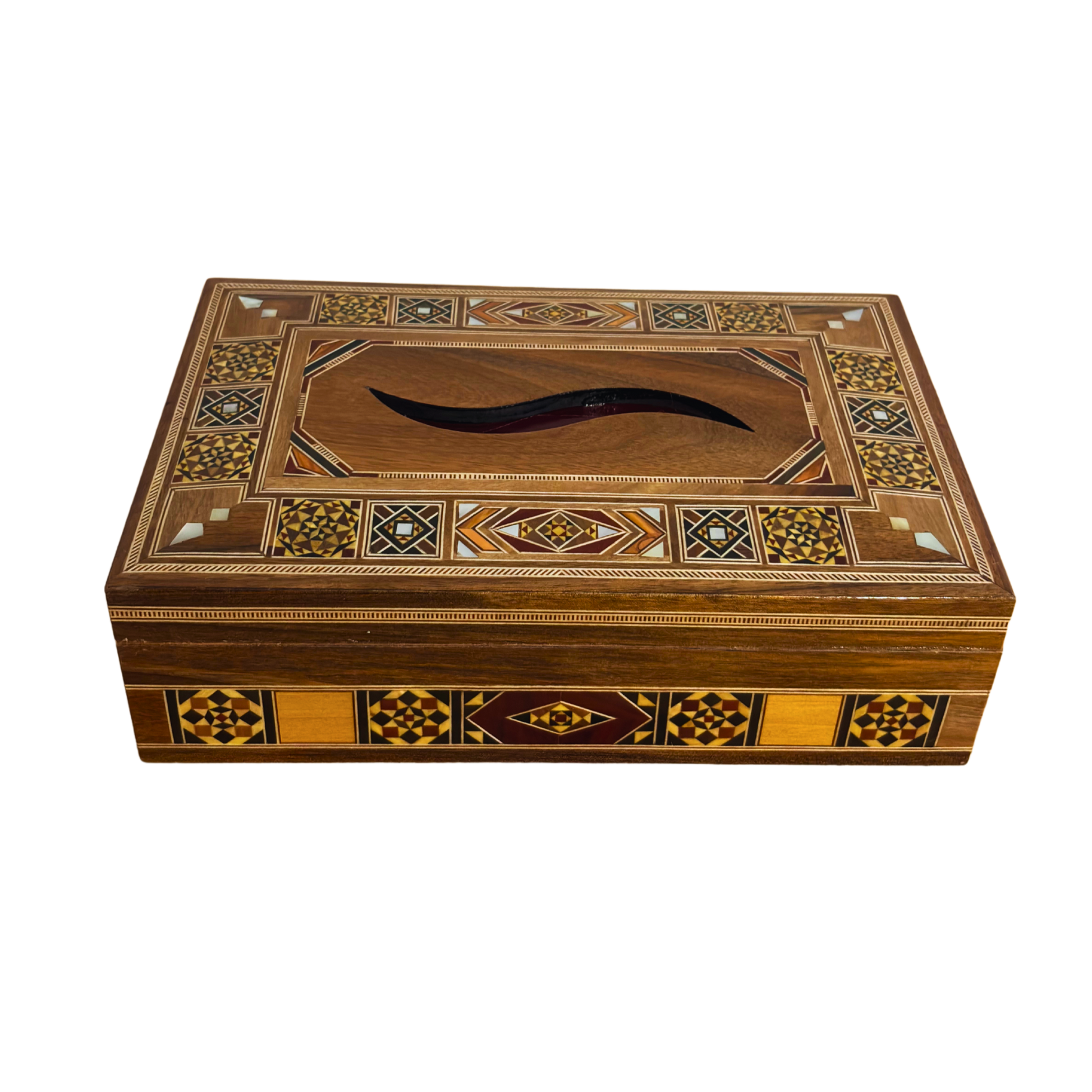Elegant Damascene Mosaic Wooden Tissue Box – Mother of Pearl Inlay & Velvet Interior
