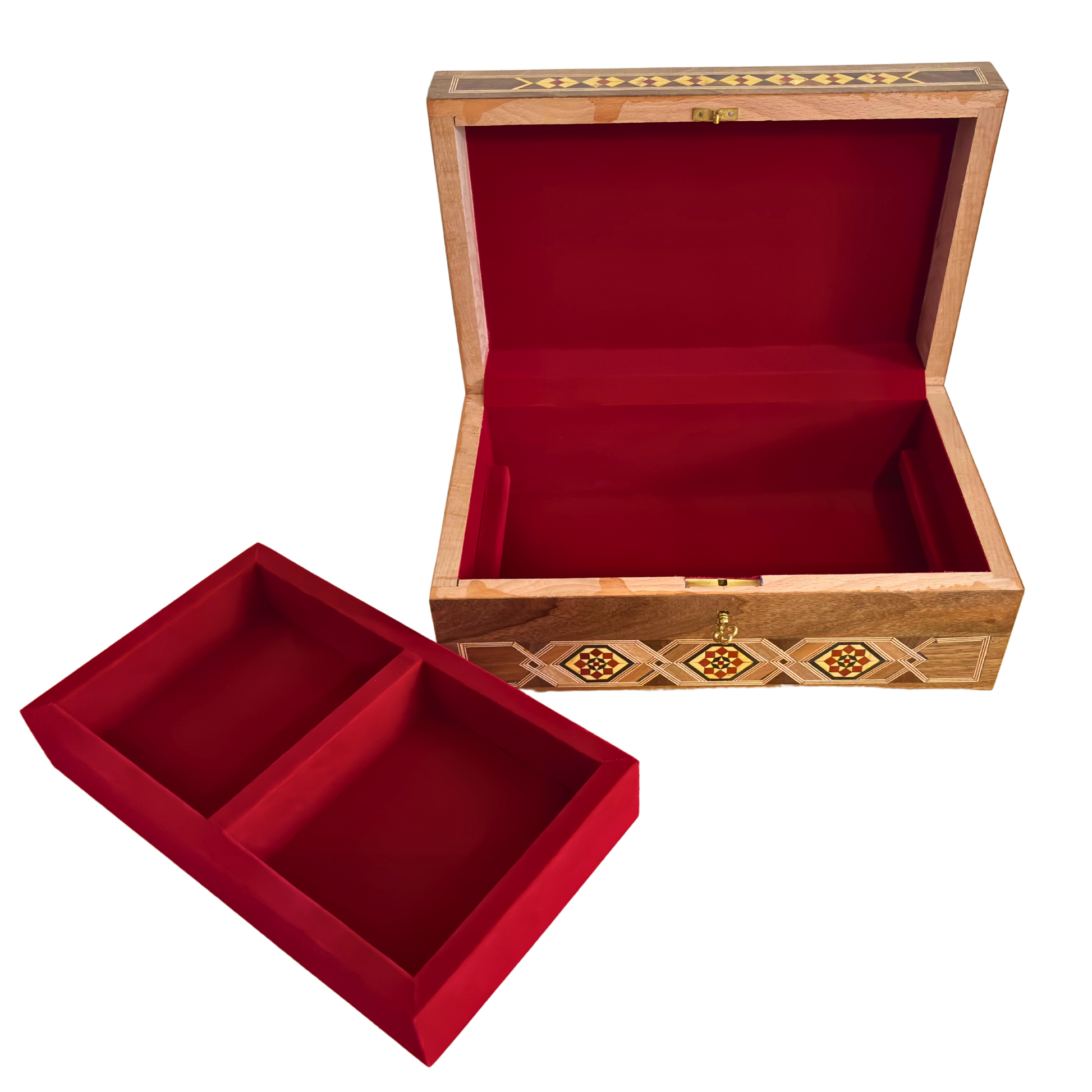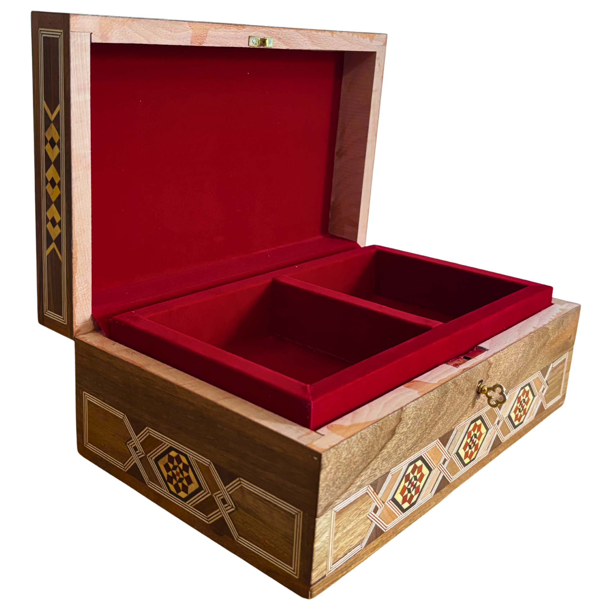 Grande Caixa de Mosaico Damasceno Artesanal com Fechadura – Baú de Joias de Madeira Multi-Nível com Incrustação de Madrepérola