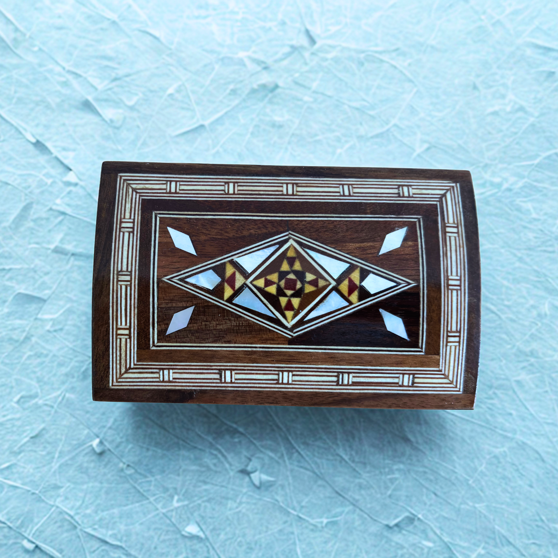 Esta elegante caixa retangular pequena é meticulosamente feita à mão com madeiras nobres de nogueira, faia, limoeiro e pinho amarelo. Enfeitada com delicadas incrustações de madrepérola, apresenta padrões geométricos clássicos que realçam a arte tradicional do Oriente Médio.