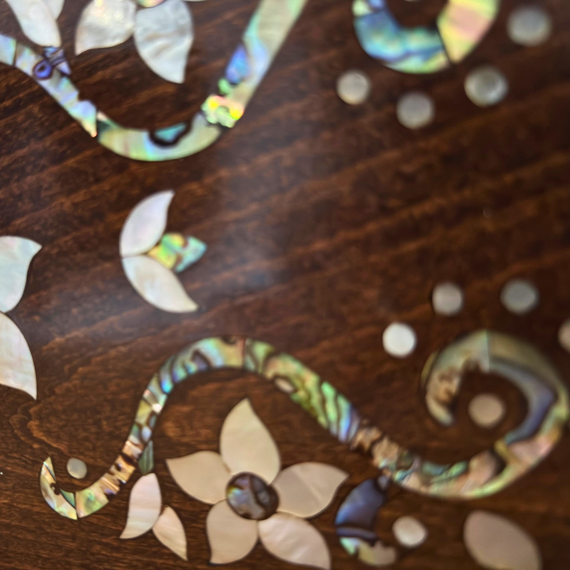 As incrustações florais em madrepérola brilham sobre a madeira de nogueira, refletindo a tradição e o esplendor da arte síria.