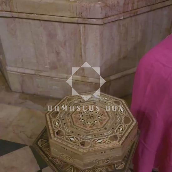 Bu zarif sekizgen Şam kutusu, geleneksel ahşap mozaik işçiliğinin zarafetini ve geometrik dengesini yansıtır.