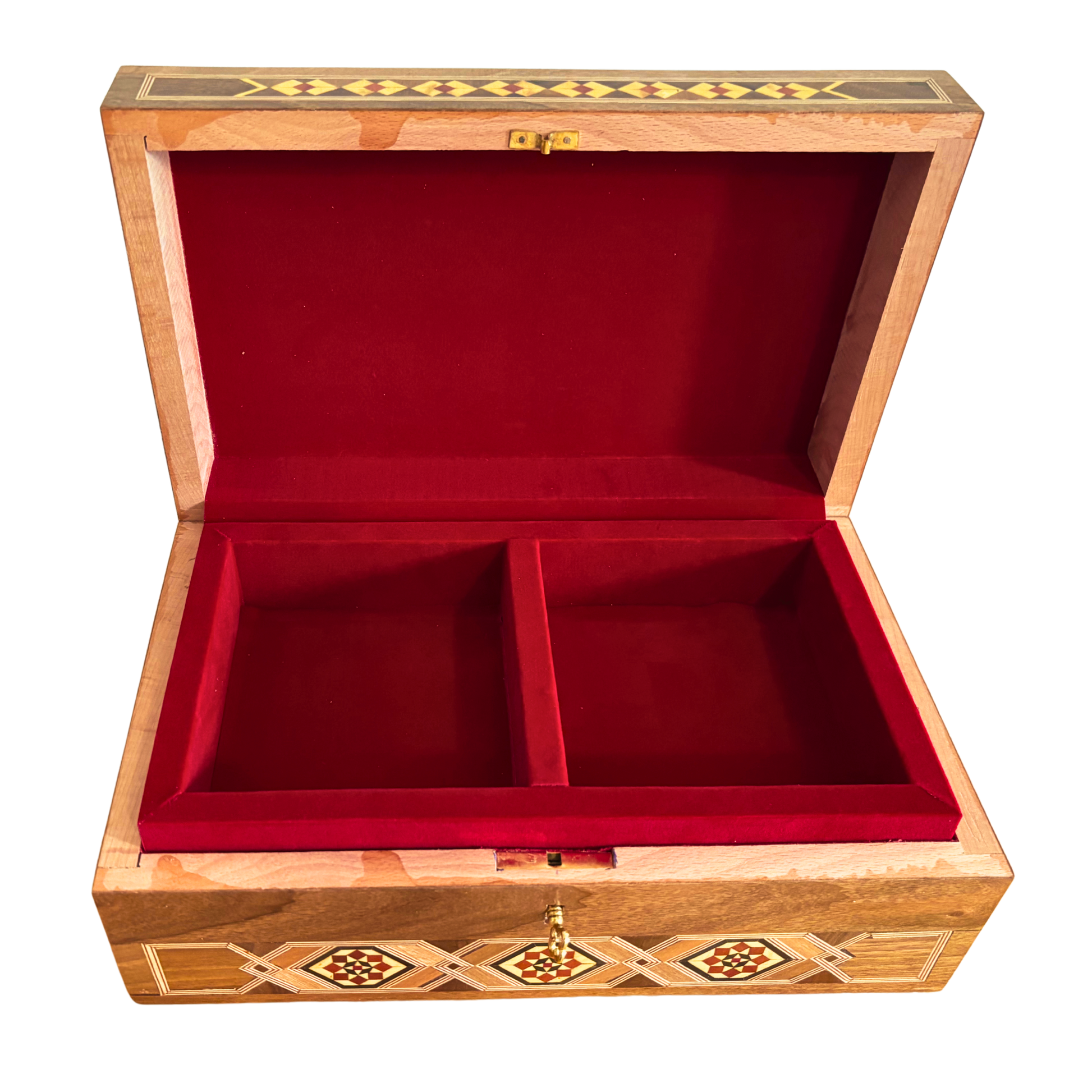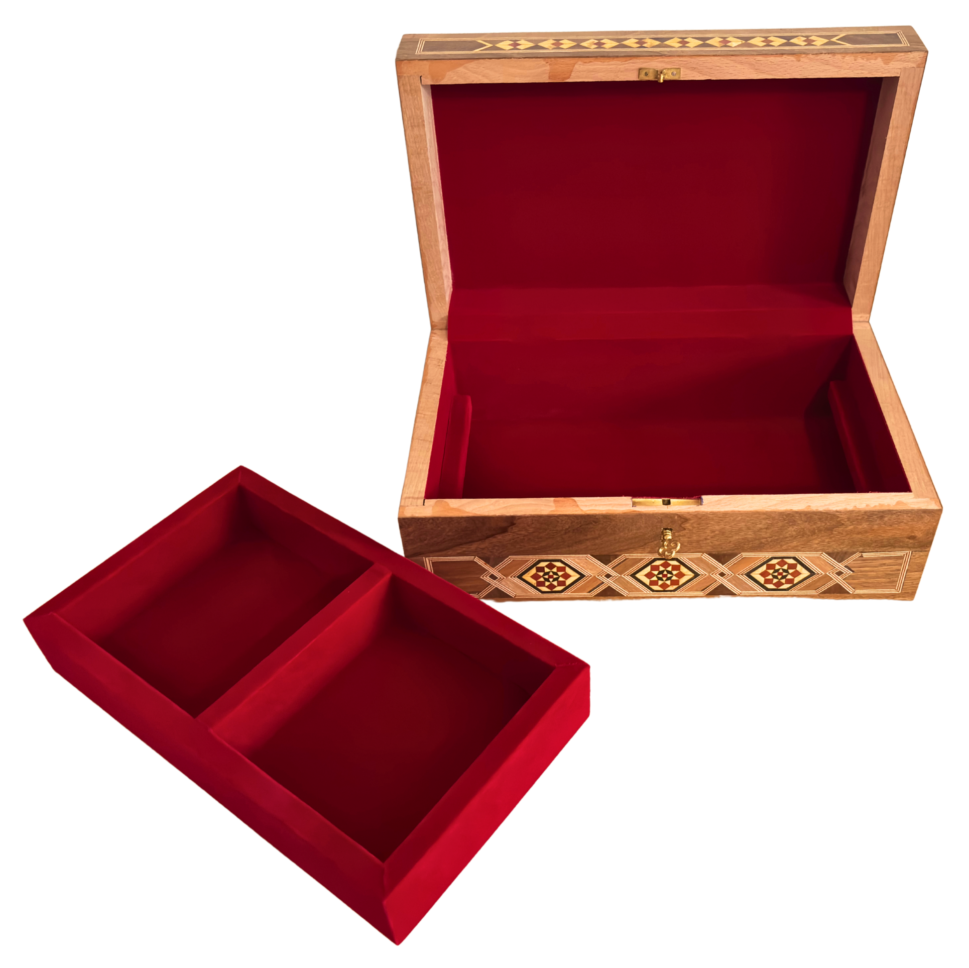 Bu büyük, el yapımı Damask mozaik kutu gerçek bir sanat eseridir. İnce gül, okaliptüs, kayın, ceviz, limon ve sarı çam ağacından özenle üretilmiş olup, yüzyıllık tekniklerle işlenmiş sedef kakmalı ve zarif geometrik desenlerle süslenmiştir. Çok katlı iç yapısı, takılarınız, saatleriniz, değerli hatıralarınız ve küçük hazineleriniz için şık ve güvenli bir saklama alanı sunar ve klasik kilit ve anahtarla güvenle korunur.
